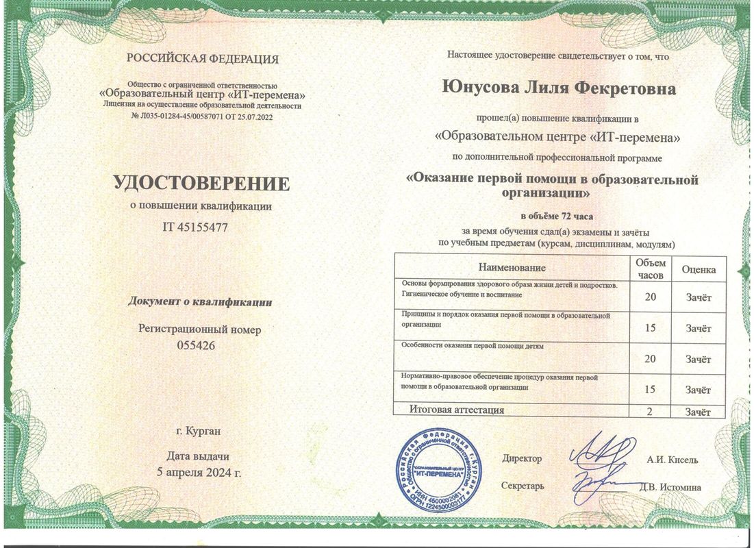 2) 2024 год Курсы «Оказание первой медицинской помощи в образовательной организации» «Образовательный центр «ИТ – перемена» в объеме 72 ч.